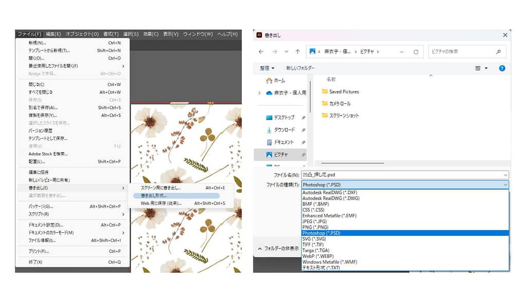 インクジェットプリントのプリンターは、photoshop形式のデータと互換性があることが多く、photshopのデータ形式であるpsdやtiffでのデータ入稿が求められることが多いです。イラストレーターのデータとは別でpsdデータに書き出すことをお勧めします。