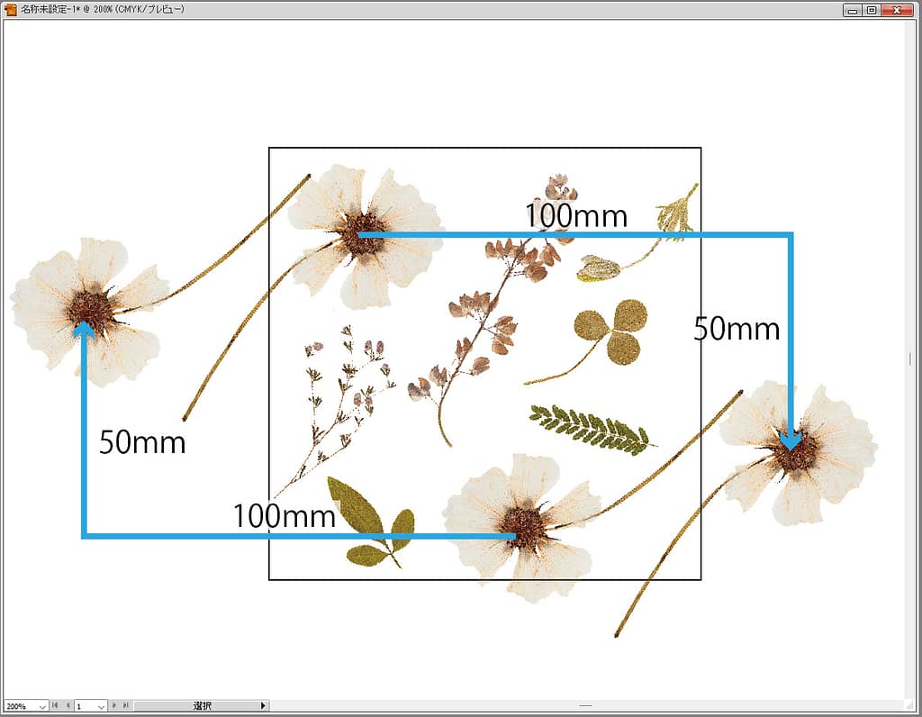 ④正方形の位置から「上下」にはみ出ている画像を均等に「100mm上」にコピー配置