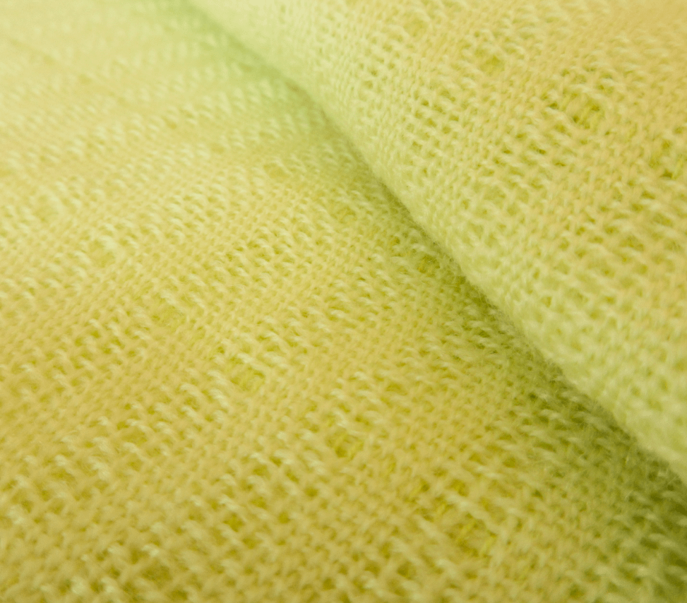 こちらはガーゼ生地では一般的なコットン素材ではなく、ベビーアルパカとシルクを使用したガーゼ生地です。ネーミングから伝わると思いますが、ベビーアルパカのなめらかな風合いと、光沢感があるシルクを組み合わせて作っています。アルパカの毛は、保温性に優れているほか、丈夫な糸で摩擦に強い糸です。