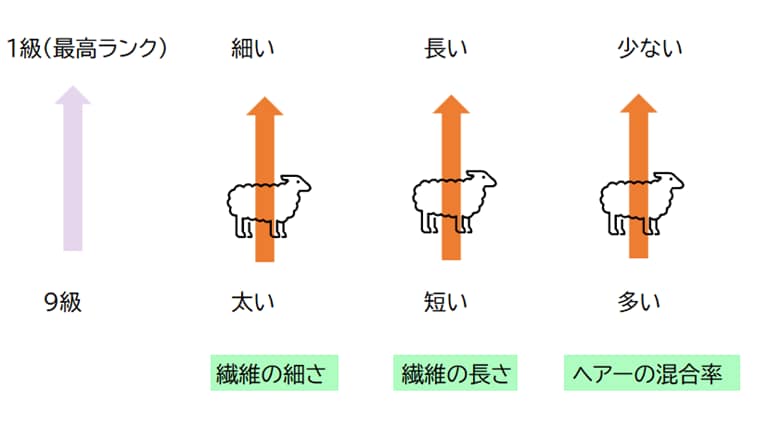 さらにカシミヤは、1から9までのランク分けがされており、“繊維の長さ”と“細さ”そして、“ヘアーの混合率”でランクが決まります。1級が最もグレードが高く、9級が最もグレードが低いものになります。