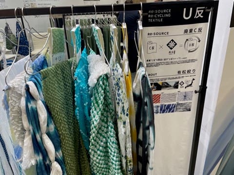 U反とは、KAJI-Fが掲げたプログラムで、C反を活用して使えるようにするUターンとかけた興味深いプログラムでした。愛知県に所在する「㈱熊谷」とコラボして、C反生地に有松絞り加工して、製品に返す取り組みをしています。絞り染にすることで、欠点をうまくぼかすことができます。絞り方の種類もたくさんあり、ファッション性の高い生地に生まれ変われるとして、C反をうまく活用していました。廃棄すると環境負荷にしかならないC反を、廃棄しないために工夫している取り組みで、今後もこのような取り組みが増えてC反廃棄を減らせていけたらいいですね。