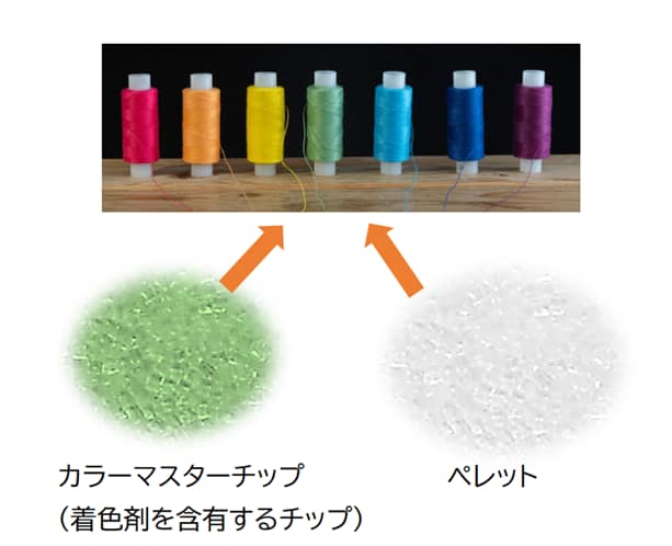 原着糸とは、原料自体に顔料や染料を混ぜて着色した糸を指します。主にナイロンやポリエステル、アクリルなどの合成繊維に、顔料を入れて製造されます。原着糸の製造は、ポリエステルなどの原料となるベースチップであるペレットに着色剤を含有するカラーマスターチップと呼ばれる顔料を混ぜて作られます。これらを混合して、溶かして紡糸することで、色のついた原着糸が出来上がります。原着を使用することで、精練(サイジング剤(糊)を製織時に使用する場合は剤を落とすために染色は省いても精練することもあります。)や染色の工程を省くことができます。