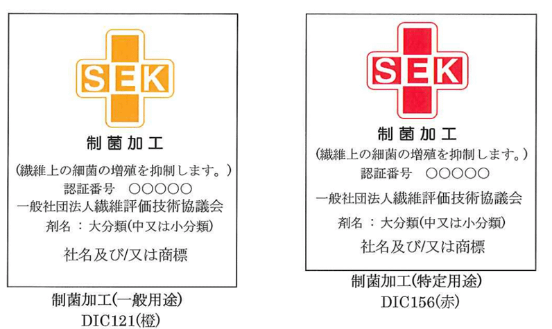 抗菌防臭加工は、青色、制菌加工の一般用途は橙色、制菌加工の特定用途は赤色のSEKマークになっています。