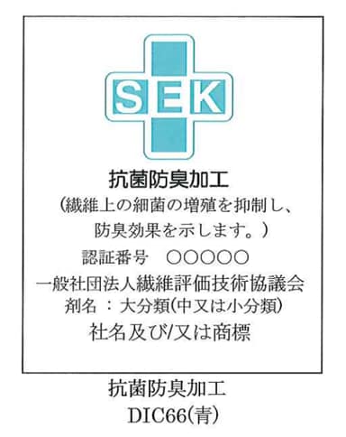 SEKマークとは、一般社団法人繊維評価技術協議会が繊維製品の「機能性」・「耐久性」・「安全性」を認証するマークです。SEKとは「清潔(S)・衛生(E)・快適(K)」からきています。抗菌防臭加工や制菌加工を施した繊維製品の表示用語、評価方法・基準、安全性などに自主基準を設け、その基準に合格することで、SEKマークを使用することが許可されます。