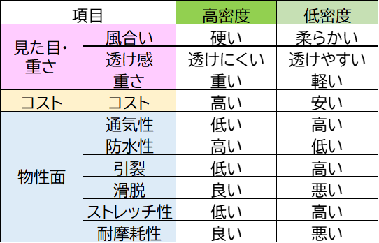 今回は、高密度生地と低密度生地を比較して、違いや特徴を紹介したいと思います。