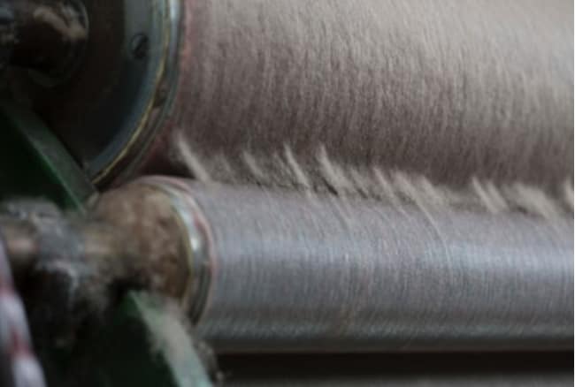 この工程により、カ―ディングでは取り除ききれなかった不要な糸を落とし、より均整な糸に仕上がります。コーミング工程で、表面の不要な繊維は約20%取り除くことが可能と言われています。この工程のおかがでコーマ糸は、カード糸よりも毛羽が少なく、ツヤのある上質な糸になります。