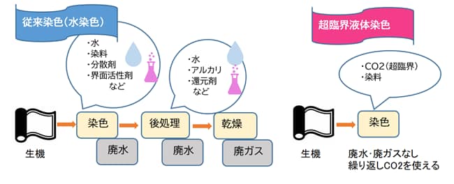 - 水を使わず、CO2と染料で染める環境配慮染色法