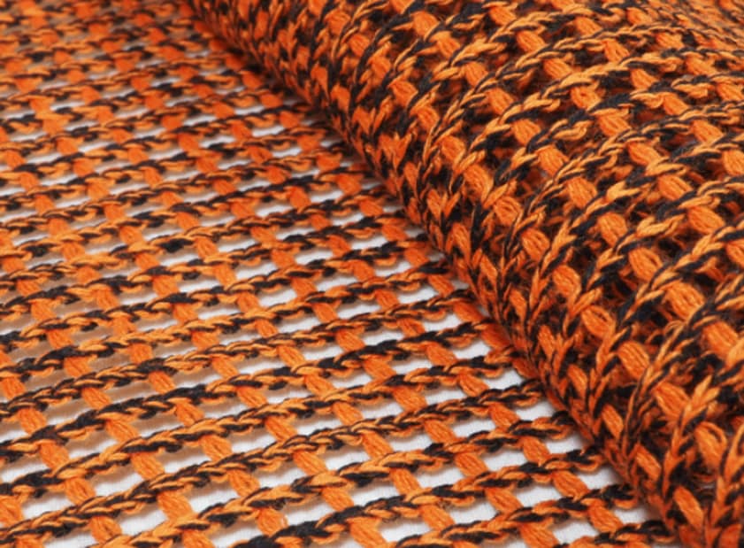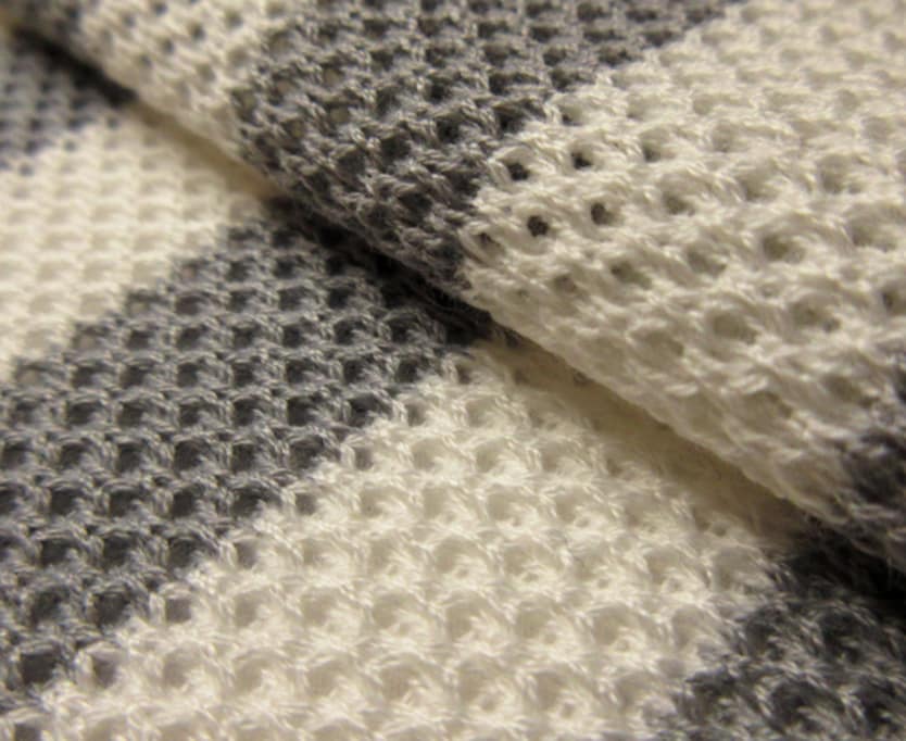 メッシュ生地とは、穴の空いた生地の総称を指します。主にトリコット編み機やラッセル編み機などで作られることが多いです。編み目が開いていることで、凹凸のある立体的な生地に仕上がります。この穴により、通気性がよくなるのでムレにくく、スポーツのユニフォームや、靴の素材にも使用されています。