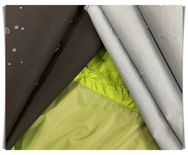 防水加工は主に、コーティングやフィルム貼り合わせの被膜加工により、生地の目(穴)を完全に防ぎ、水の侵入を防ぎます。生地に撥水加工が施されていない限り、生地は水を吸いますが、膜のおかげで水を通すことはありません。