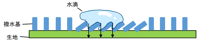 ほとんどの生地は糸に特殊加工をしていない限り、水を引き寄せる力が働きます。ここに撥水剤を塗布すると、生地の表面に撥水基が立ち、生地が水を引き寄せる力を妨げます。目に見えない細かい撥水基が産毛のように生地の上に立つことで、水が持つ表面張力が生地の水を引き寄せる力より勝り、凝縮して球状になるのです。こうして球状になった水滴は、生地に吸収されることなく水がはじかれます。