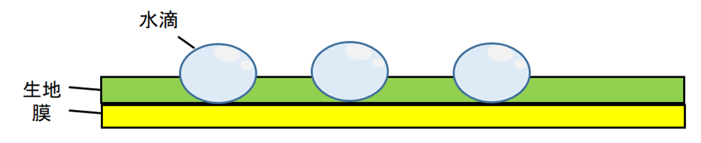 防水性を測るテスト法として、耐水圧テストが一例としてあります。耐水圧テストでは、水圧を生地にかけて、どのくらいホールドすることができるかを測ります。コーティングの場合は、フィルムを貼り合わせるラミネート加工に比べると耐水圧は劣ります。