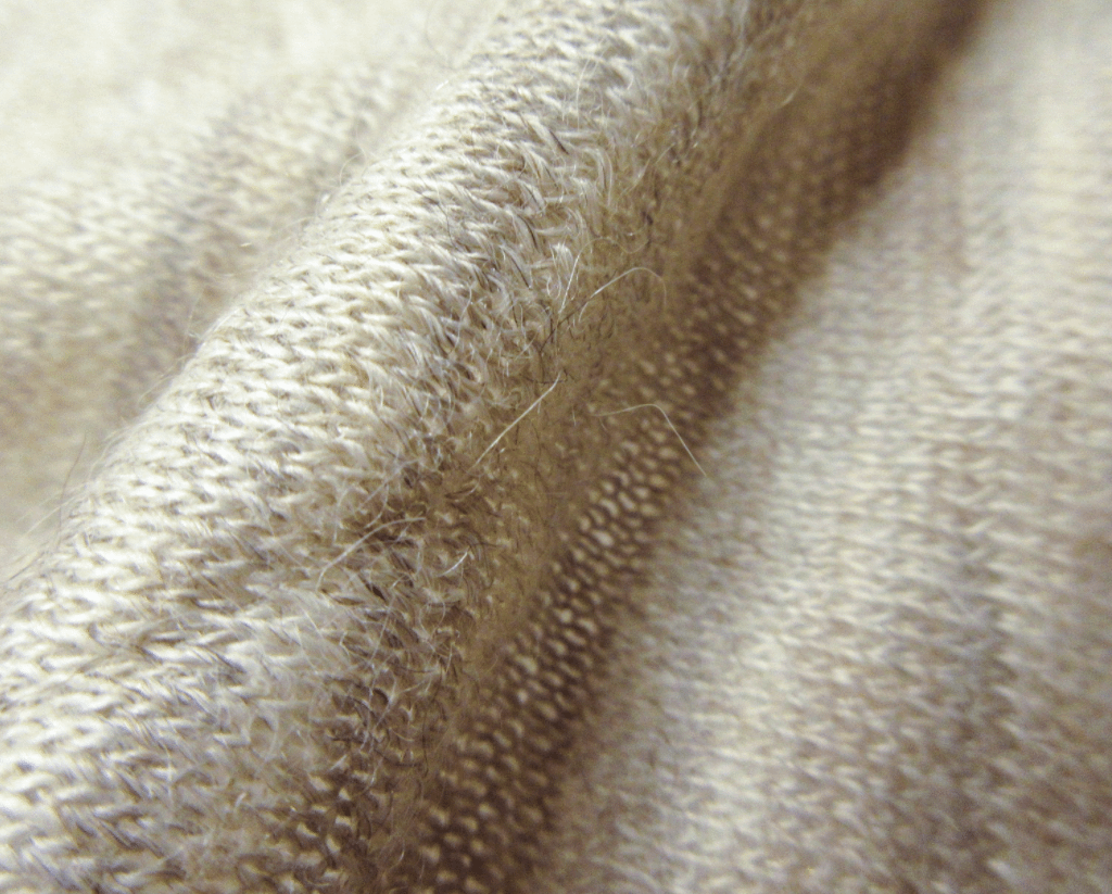 こちらはガーゼ生地では一般的なコットン素材ではなく、ベビーアルパカとシルクを使用したガーゼ生地です。ネーミングから伝わると思いますが、ベビーアルパカのなめらかな風合いと、光沢感があるシルクを組み合わせて作っています。アルパカの毛は、保温性に優れているほか、丈夫な糸で摩擦に強い糸です。