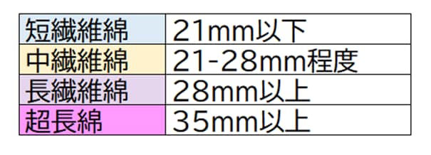 綿のランクは、基本的に繊維長が長くなればなるほど、高くなります。そしてスーピマコットンは、最高ランクと言われる「超長綿」に該当します。スーピマコットンは繊維長が、35mm~40mmと、とても長くしなやかな繊維でできています。身近なほとんどのコットン製品は、中繊維綿でできています。その中繊維綿と比べると繊維長が10mmほど長く、いかに長い繊維に部類するかお分かりいただけるかと思います。