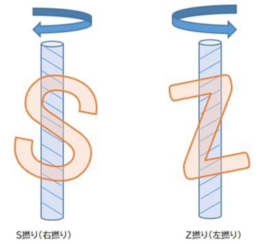 撚糸は、撚りを回転する方向で、「S(右撚り)」と「Z(左撚り)」に分類されます。「Z(左撚り)」の方が一般的に使用されることが多いです。