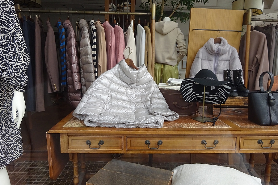 秋が深まり寒さが増すにつれてコートの出番が増えましたが、大きく分けてお洒落感覚優先ともいえるウールの一重コート(羽織るタイプ、七分丈などの特徴のあるもの)と軽いダウン系(モンクレーやカナダグースをはじめ各ブランド内に多く見られる)、フェイクファー(モコモコといわれるふんわりしたもの、ボアタイプ、フリースタイプなど)が挙げられます。薄手のキルティング素材はごく自然な一枚の布のように扱われて新鮮なアウターになっているのが気になります。